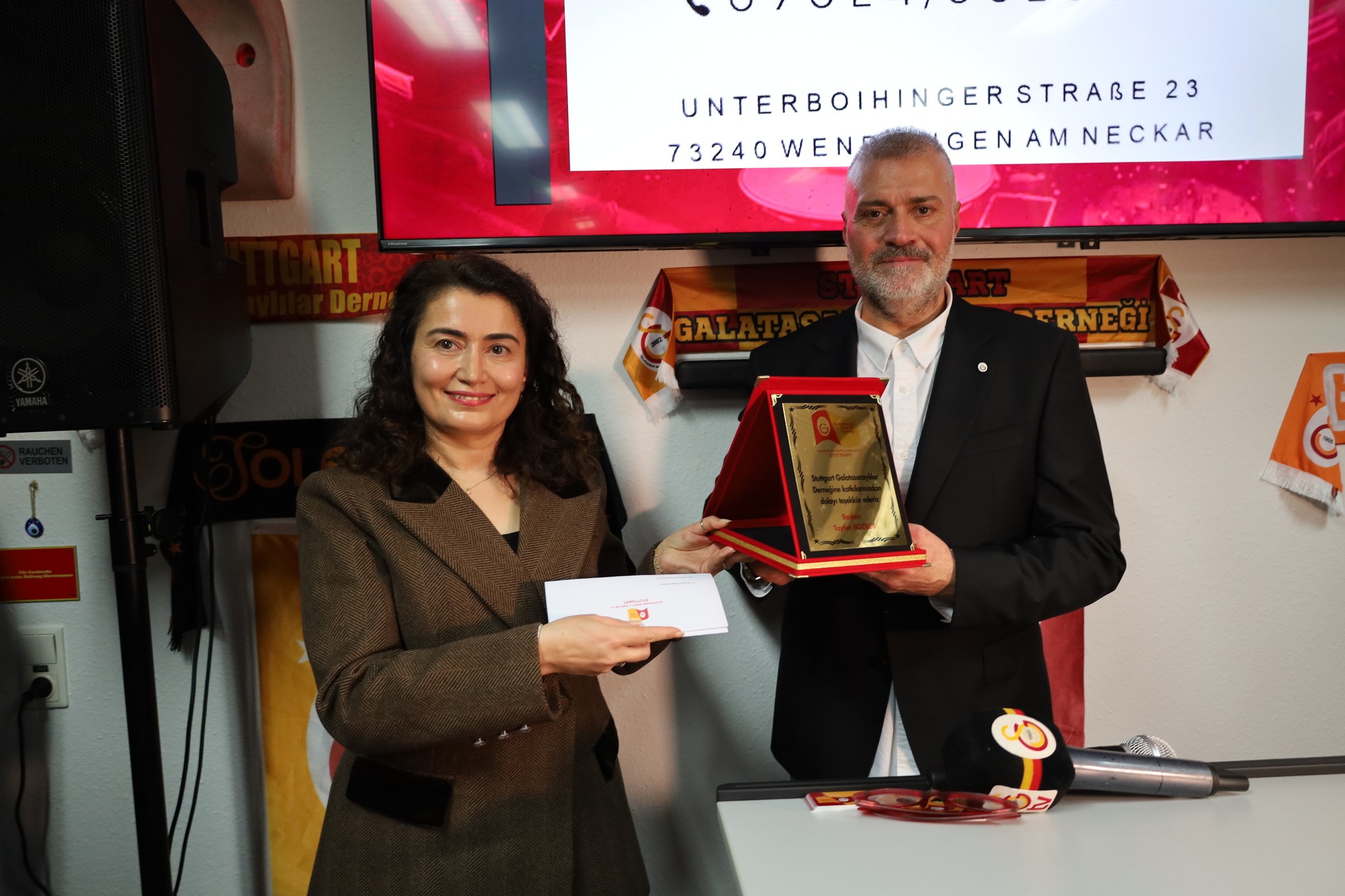 Stuttgart Başkonsolosu Makbule Kaçar Koçak yaptığı konuşmada, “Spor derneklerinin faaliyetlerini devam ettirdiklerini görmekten çok mutluyum. Galatasaray bizim gururumuz. Diğer takımlarla geçen sene elde ettikleri başarıları memnuniyetle izliyoruz. Ali Sami Yen ve arkadaşlarının bundan 120 yıl önce ‘İngilizler gibi biz toplu olarak bir oyun sergilemek için takım kuracağız ve bu takım kendi adına ve kendi renklerine sahip olacak, bu takım yurt dışında yenecek’ demesi Galatasaray’ın hakkını verdi, bize pek çok gurur yaşattı, yaşatmaya devam edecek. Bu dernek gençleri bir araya getirecek ve ailelerin bir araya geleceği, maç izleyeceği bir dernek olacak. Hayırlı olsun” dedi.